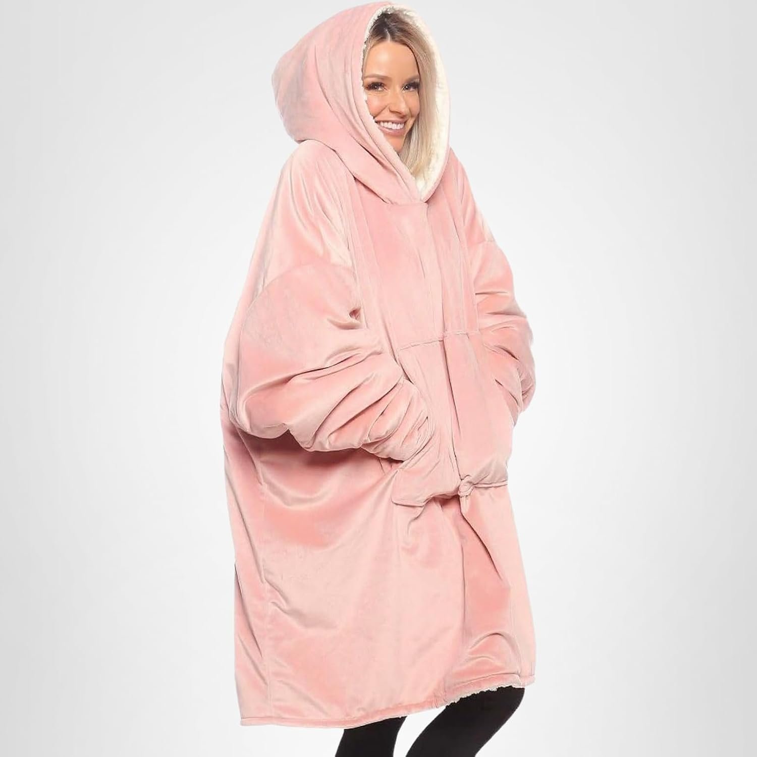 Functionality is at the heart of this wearable blanket. It includes a massive plush hood that can double as a pillow for naps and a giant marsupial pocket. This pocket is perfect for keeping your hands warm or storing essentials like your phone, snacks, or a TV remote. One of the most appreciated details is the ribbed cuffs on the sleeves. Unlike a traditional blanket that slides off when you move, the cuffs on this wearable blanket keep the sleeves securely in place, allowing you to cook, type, or play games without the fabric getting in the way.