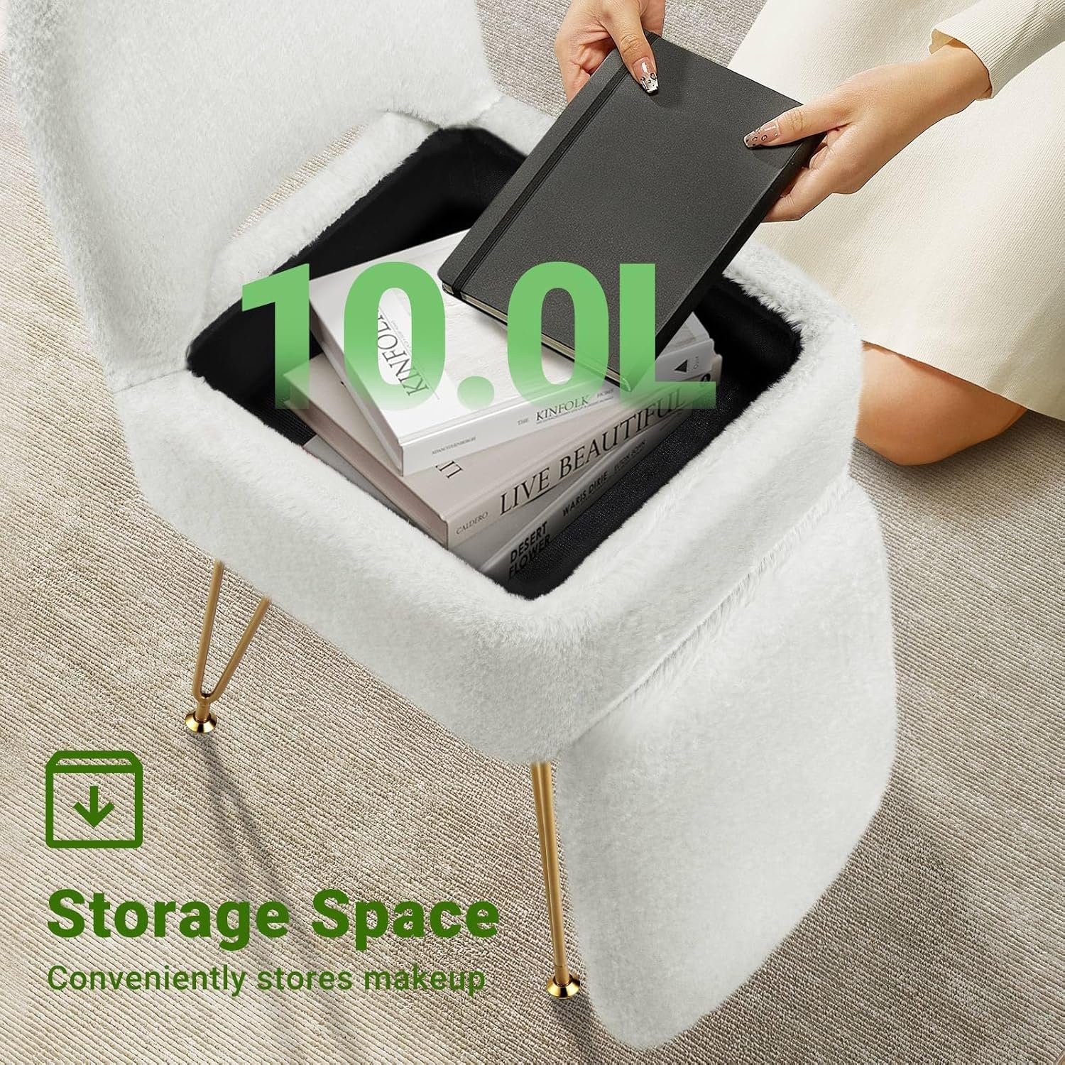 Beneath the plush “Teddy Velvet” or Faux Fur seat lies a hidden storage compartment with an approximate 10L capacity. This stool chair with storage is perfect for organizing: